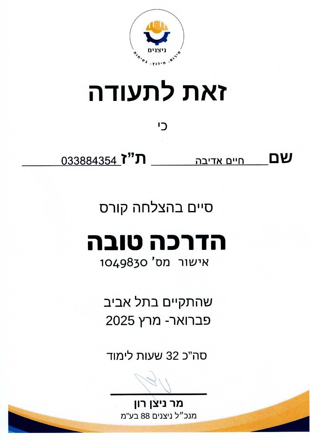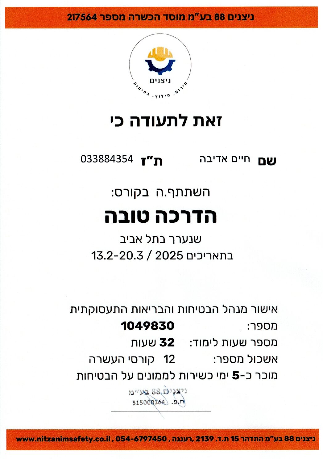 אישור מנהל הבטיחות והבריאות התעסוקתית- כמדריך בטיחות